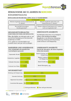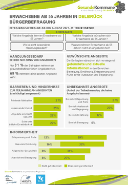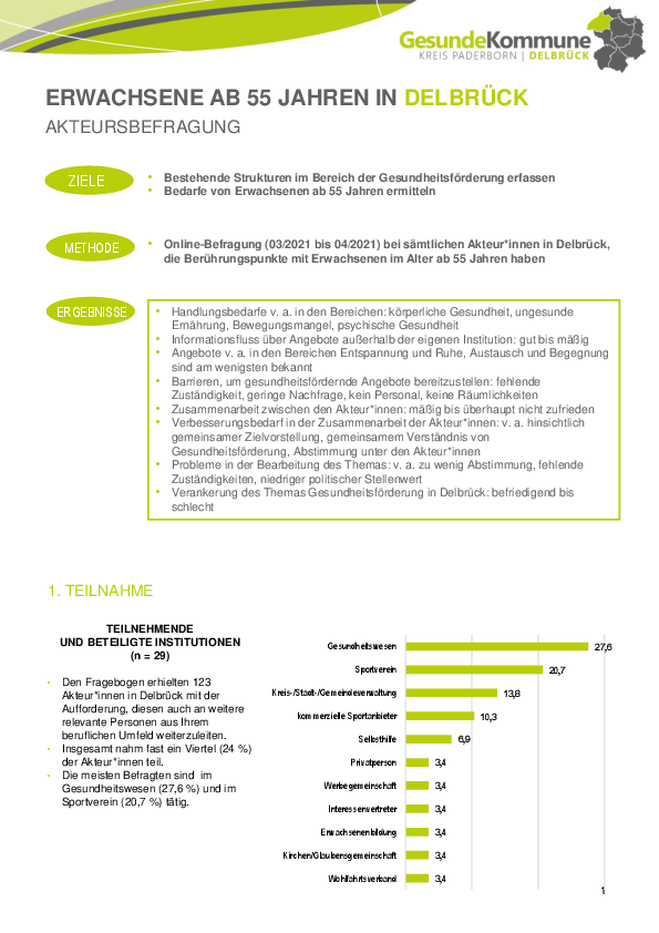Im Frühjahr 2021 befragte das Projektteam „Gesunde Kommune“ eine Vielzahl an Akteur*innen in Delbrück, die Berührungspunkte zu Menschen ab dem 55. Lebensjahr haben. Hierbei wurde das Projektteam von der Stadt Delbrück und vom Stadtsportverband Delbrück aktiv unterstützt. Ziel der Befragung war es, die Bedarfe dieser Zielgruppe sowie bereits vorhandene Angebotsstrukturen zu erfassen. Die Ergebnisse zeigen unter anderem, dass die Mehrheit der Akteur*innen nur mäßig mit der derzeitigen Zusammenarbeit zufrieden sind. Handlungsbedarfe bei Erwachsenen ab 55 Jahren werden vor allem in den Bereichen körperliche Gesundheit, ungesunde Ernährung, Bewegungsmangel und psychische Gesundheit gesehen.