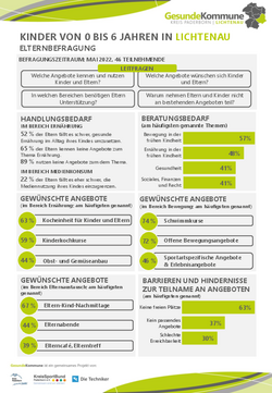 Die Ergebnisse zeigen auf, dass das Thema Gesundheitsförderung im beruflichen Alltag der Akteur*innen einen hohen bis sehr hohen Stellenwert einnimmt. Probleme in der Bearbeitung entstehen vor allen durch geringe finanzielle Mittel, einen niedrigen politischen Stellenwert, Personalmangel sowie fehlende Zuständigkeiten. Handlungsbedarfe im Hinblick auf die Zielgruppe sehen die Akteur*innen vor allem in den Bereichen: Konsum elektronische Medien, Bewegung und Ernährung zuhause, Kinder mit Verhaltensauffälligkeiten.