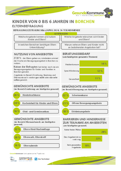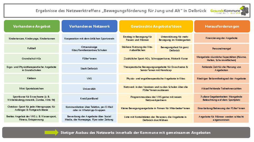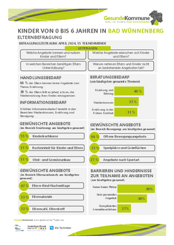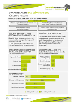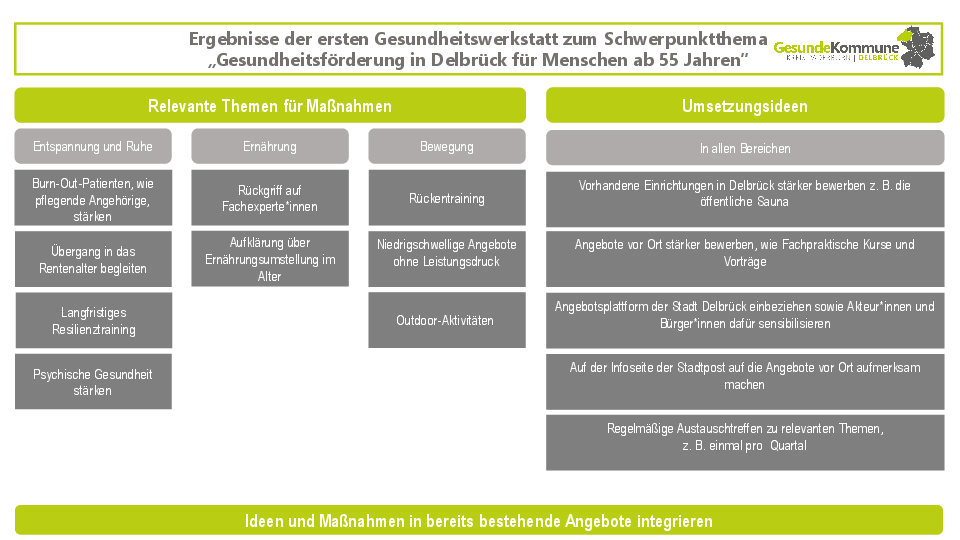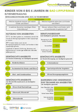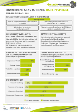 Die Ergebnisse zeigen auf, dass vor allem der Überblick über bestehende Angebote in Delbrück fehlt. Zudem wünschen sich Eltern mehr Angebote vor Ort zum Thema Ernährung. Menschen ab 55 Jahren wünschen sich insbesondere zu den Themen Entspannung und Ruhe, gesunde Ernährung und allgemeine Gesundheit mehr Informationen.