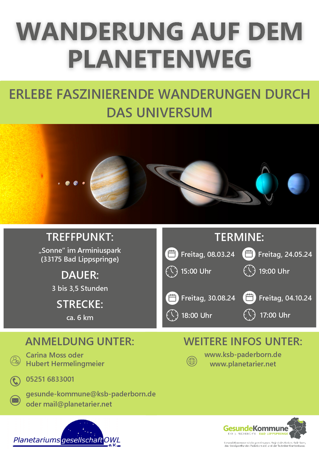 Unter dem Motto „Körper und Geist wollen gestärkt sein“ laden das Team der Gesunden Kommune gemeinsam mit Hubert Hermelingmeier zu insgesamt vier Wanderungen auf dem Planetenweg in Bad Lippspringe ein. Dieser gilt als einer der schönsten und abwechslungsreichsten Wege Deutschlands. Gemeinsam wird entlang der Planetenskulpturen gewandert. Zunächst durch die Innenstadt und später durch den Kurwald an der Strohte entlang. Der Weg führt dann weiter vorbei an der Thune zurück in den Arminiuspark. An jeder Planetenskulptur wird eine kleine Pause gemacht, die mit Erläuterungen zu dem jeweiligen Planeten gefüllt ist. Wir wandern am Abend, weil dann bei gutem Wetter die Himmelbeobachtung mit einem Teleskop eingebunden werden kann. Der Treffpunkt befindet sich an der „Sonne“ im Arminiuspark. Die Wanderung erstreckt sich über ca. 7 km und dauert etwa 3 bis 3,5 Stunden. Mehrere Schutzhütten entlang des Weges bieten Möglichkeiten zum Picknick. Bringe bei Bedarf etwas Verpflegung mit und achte auf witterungsentsprechende Bekleidung und gutes Schuhwerk.