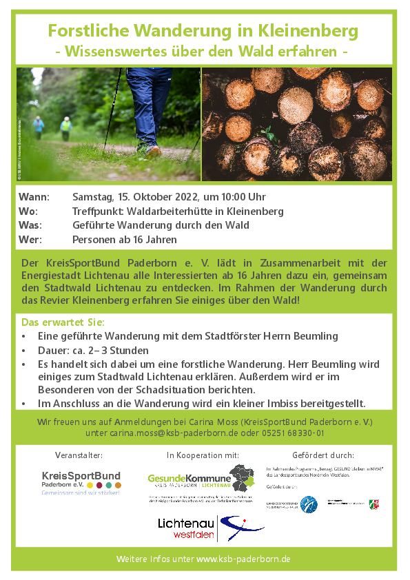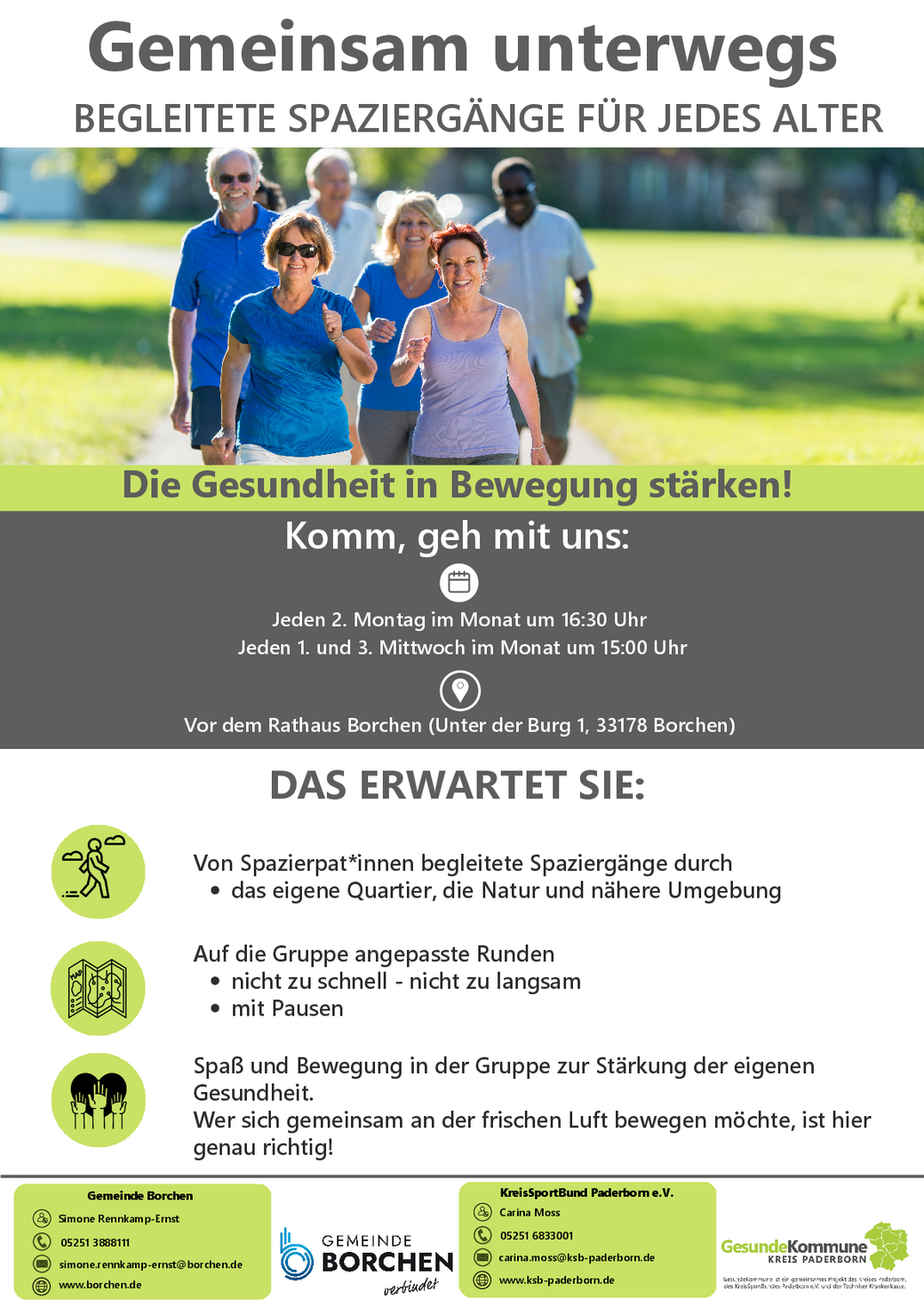 Der KSB und die Stadt Bad Wünnenberg freuen sich über die positive Resonanz auf das Angebot der begleiteten Spaziergänge. Seit Oktober letzten Jahres finden die Spaziergänge regelmäßig in Bad Wünnenberg statt. Aufgrund der hohen Motivation der Spazierpatinnen und Spazierpaten wird das Angebot ab Juli erweitert: Ab sofort werden die Spaziergänge an jedem 1. und 3. Montag im Monat angeboten. Treffpunkt ist jeweils um 10 Uhr an der Konzertmuscheln im Kurpark Bad Wünnenberg.
