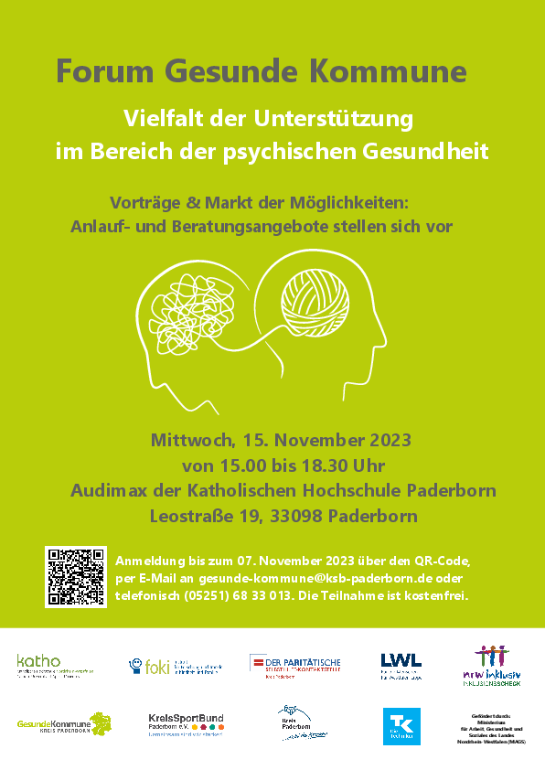 Larissa Rieke-Nutz (Dekanatsreferentin des Fachbereichs Sozialwesen, katho, Paderborn) betonte stellvertretend für Dekan des Fachbereichs Sozialwesen Prof. Dr. Patrick Isele in ihrem Grußwort: „Wir freuen uns, dass das zeitlich begrenzte Projekt „Gesunde Kommune“ in Form des „katho-Forums „Gesunde Kommune“ weiterlebt und erfolgreich verstetigt werden konnte. Wir schätzen die kreative und gute Zusammenarbeit zwischen unserem Fachbereich Sozialwesen und dem KSB sehr. Mit dem katho-Forum „Gesunde Kommune“ möchten wir dabei helfen, die kleinen alltäglichen Knoten im Kopf zu strukturieren und durch den Wissensaustausch hier vor Ort dazu beitragen, mit neuen Gedankenanstößen, Strategien und ggfs. sogar etwas mehr Struktur nach Hause gehen zu können.“ Als Schirmherr ergänzte Landrat Christoph Rüther in seinen Grußworten: „Selbstregulation bewegt uns in allen Lebensphasen. Ein Ausgleich zum stressigen Alltag dient dazu, den Kopf freizubekommen und etwas für sich zu tun. Mein Dank gilt allen, die sich für andere einsetzen und das katho-Forum ermöglichen und unterstützen.“