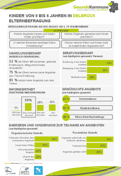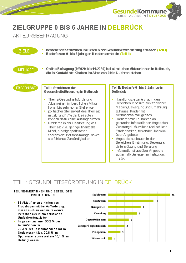 Im September 2020 befragte das Projektteam "Gesunde Kommune" eine Vielzahl von Akteur*innen in Delbrück, die in Kontakt mit der Zielgruppe von 0 bis 6 Jahren stehen (wie zum Beispiel Pädagogische Fachkräfte der Kindertagesstätten, Therapeut*innen, Sportvereine). Dabei wurde das Projektteam von dem Stadtsportverband Delbrück sowie dem Kreisjugendamt Paderborn unterstützt. Ziel der Befragung war es, die bereits bestehenden Strukturen im Bereich der Gesundheitsförderung sowie die konkreten Bedarfe der 0- bis 6-Jährigen zu erfassen.
