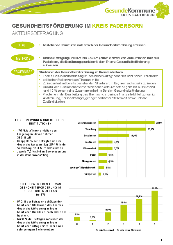 Von Januar bis Februar 2021 befragte das Projektteam Akteur*innen im Kreis Paderborn, die Berührungspunkte mit dem Thema Gesundheitsförderung aufweisen, mittels einer Online-Befragung. Ziel war es, die bestehenden Strukturen im Bereich der Gesundheitsförderung im Kreis Paderborn zu ermitteln und Handlungsbedarfe aufzuzeigen.