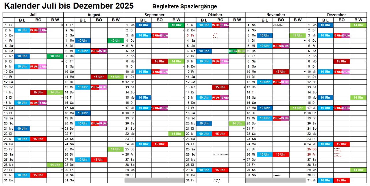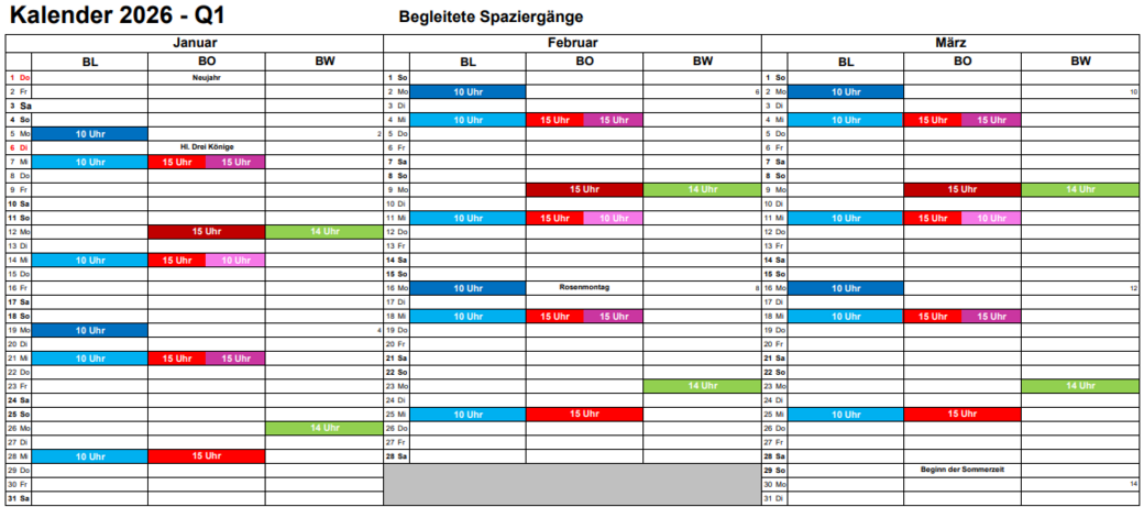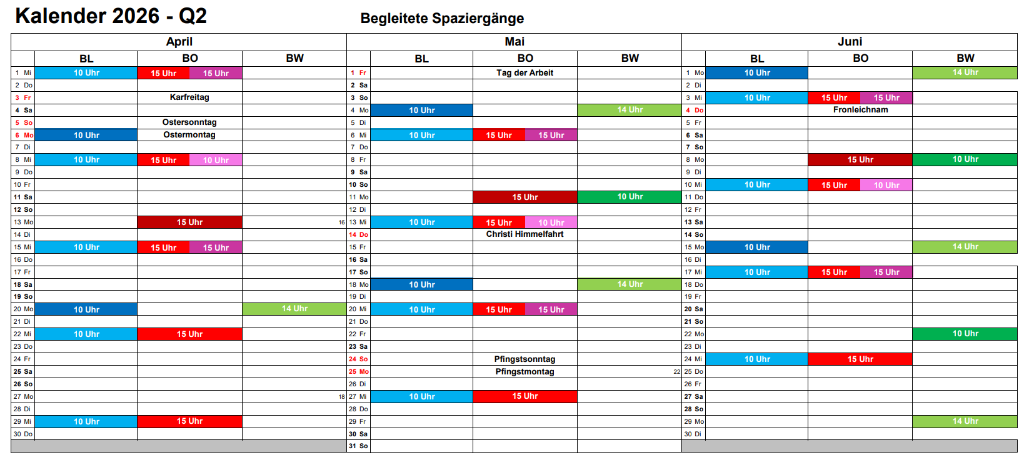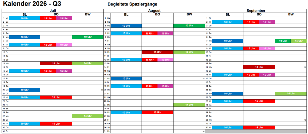 Spazierengehen im eigenen Quartier ist eine besonders alltagsnahe, vertraute und wirksame Form der Bewegung in der Natur. Begleitete Spaziergänge sollen dabei helfen, Menschen zu mehr Bewegung anzuregen und der zunehmenden Vereinsamung gerade älterer Menschen entgegenwirken. Damit leisten sie einen wichtigen Beitrag zur Gesundheitsförderung.
