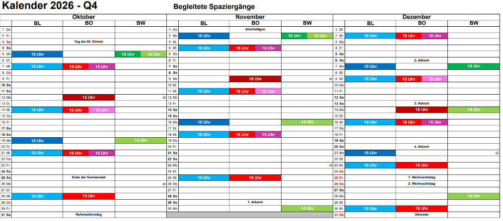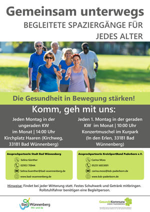 Jeden 1., 2. 3. und 4. Mittwoch im Monat finden um 15:00 Uhr zwei begleitete Spaziergänge statt. Treffpunkt für den ersten Spaziergang ist vor dem Rathaus in Borchen. Der zweite Mittwochsspaziergang (jeden 1. und 3. Mittwoch im Monat) startet vor dem Begegnungszentrum Nordborchen am Mallincrodthof.