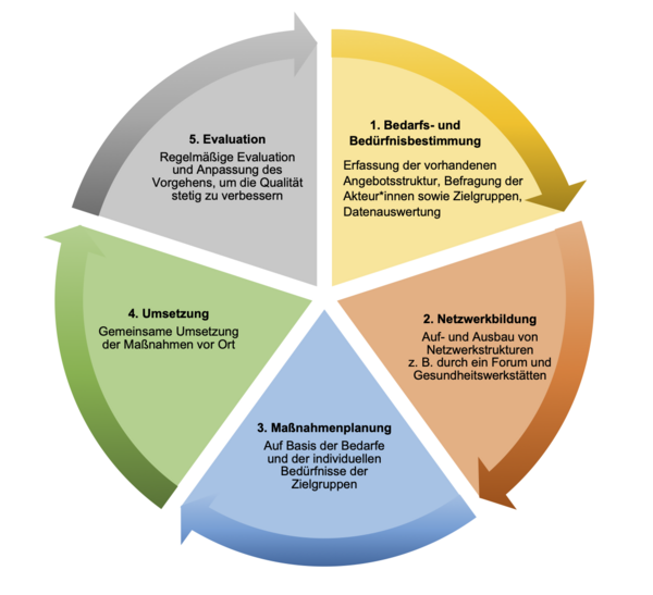 Die Vorgehensweise des Projektes orientiert sich am Public Health Action Cycle. Hierbei erfolgen zu Beginn des Projektes Befragungen zum aktuellen Stand der Gesundheitsförderung sowohl auf Kreisebene als auch in den teilnehmenden Städten und Gemeinden. Zudem werden in den Städten und Gemeinden vor Ort die Akteur*innen zu den bestehenden Bedarfen sowie die Zielgruppen (bei den 0–6-Jährigen stellvertretend die Eltern) zu ihren individuellen Bedürfnissen befragt. Darüber hinaus werden bereits vorhandene Angebote erfasst und einzelne Daten aus der Sozial- und Gesundheitsberichterstattung hinzugezogen. In einem nächsten Schritt werden Netzwerkstrukturen auf Ebene des Kreises und auf Ebene der einzelnen Städten und Gemeinden aus- oder ggf. neu aufgebaut. Auf Grundlage der Bedarfs- und Bedürfnisbestimmung und der Netzwerkstrukturen werden individuelle, auf die jeweilige Stadt und Gemeinde zugeschnittene Maßnahmen geplant, umgesetzt und anschließend evaluiert. Das Projekt wird schrittweise in allen interessierten Städten und Gemeinden des Kreises Paderborn anhand des beschriebenen Projektzyklus durchgeführt.