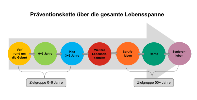 Eine Präventionskette ist eine Gesamtstrategie, die auf kommunaler Ebene den Rahmen schafft, um das vielfältige Unterstützungsangebot öffentlicher und privater Träger und Akteure besser zu verbinden. Sie zielt darauf ab, allen Menschen eine gesunde Lebensführung über das gesamte Leben hinweg zu ermöglichen. Zentral hierbei ist ein abgestimmtes Handeln aller Akteure, damit vor allem die Übergänge zwischen den einzelnen Lebensphasen optimal begleitet werden und eine durchgängige, lückenlose Förderung und Unterstützung aller sozialen Gruppen möglich ist. Eine Lücke kann entstehen, wenn z. B. Unterstützungsangebote für eine bestimmte Zielgruppe fehlen oder wegbrechen. Auch wenn alle Kettenglieder vorhanden sind, können Lücken entstehen, indem einzelne Glieder nicht miteinander verbunden sind. So können z. B. für alle Altersgruppen und Bedarfe entsprechende Angebote vorhanden sein, diese sind jedoch nicht aufeinander abgestimmt und es entstehen unnötige Doppelstrukturen.