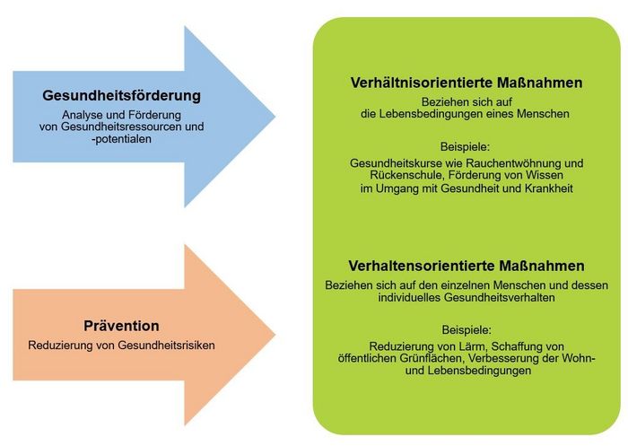 Prävention unterscheidet sich damit vom Ansatz der Gesundheitsförderung. Sie konzentriert sich insbesondere darauf, Risikofaktoren (z. B. Bewegungsmangel oder Rauchen) und Belastungen (z. B. Lärmbelastung) zu verringern, während im Fokus der Gesundheitsförderung die Stärkung von Ressourcen und Schutzfaktoren (z. B. der Umgang mit Problemen oder die Unterstützung durch das soziale Umfeld) steht. Wie im Bereich der Gesundheitsförderung, greifen präventive Maßnahmen sowohl auf der Verhaltens- als auch auf der Verhältnisebene.