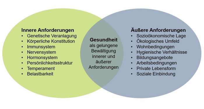 Gesundheit entsteht durch das Gleichgewicht von Risikofaktoren (z. B. Stress oder Bewegungsmangel) und Schutzfaktoren (z. B. soziale Unterstützung oder gesunde Ernährung). Es handelt sich um einen dynamischen Zustand. Dieser tritt ein, wenn ein Mensch sowohl die inneren (körperlichen und psychischen) als auch die äußeren (sozialen und materiellen) Anforderungen bewältigt. Gesundheit vermittelt einem Menschen Wohlbefinden und Lebensfreude.