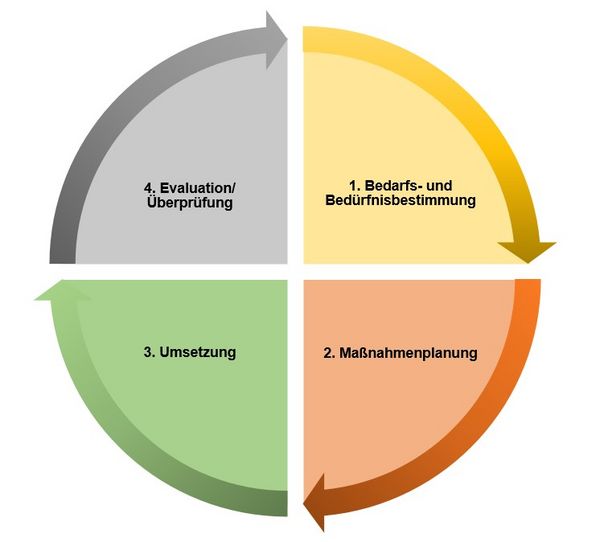 - Evaluation/Überprüfung: Nach der Durchführung der Maßnahmen wird überprüft, ob diese den gewünschten Erfolg erzielt haben. Ergebnis dieser Überprüfung kann sein, dass die Maßnahmen sich als erfolgreich bewiesen haben oder das weitere Maßnahmen oder Veränderungen der vorhandenen Maßnahmen erforderlich sind.