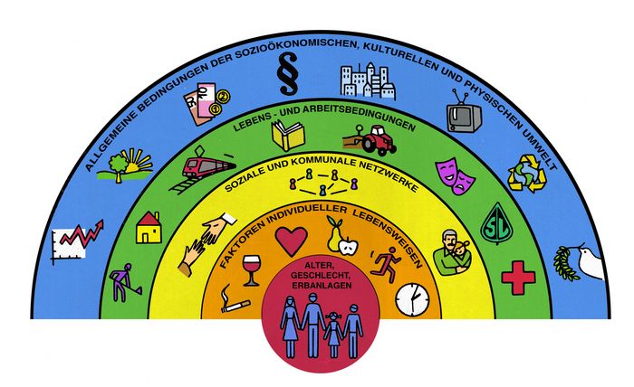 Beeinflusst wird die Gesundheit durch verschiedene Faktoren. Sie sind im Regenbogenmodell von Margret Whitehead und Göran Dahlgreen dargestellt (siehe unten). Der Kern des Modells beinhaltet das Alter, das Geschlecht und die Erbanlagen. Es handelt sich hierbei um nicht beeinflussbare, feste Faktoren.