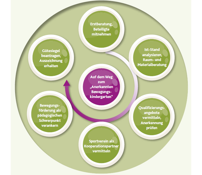 Der Schwerpunkt „Bewegungsförderung“ wird im pädagogischen Konzept Ihrer Kindertageseinrichtung durch den Träger, das pädagogische Personal und den Elternrat verankert.