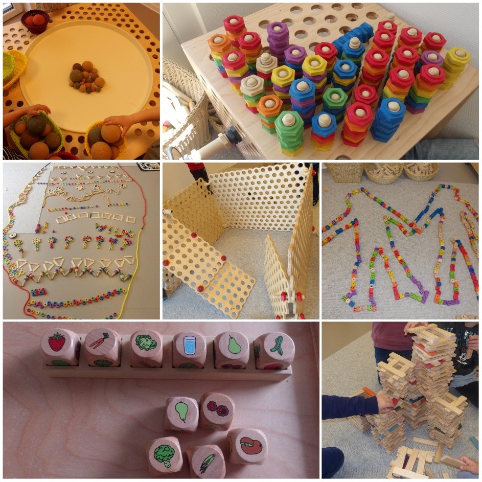 Mit Bausteinen, Kugelbahnen und Werkzeugen entstehen kreative Bauwerke und technische Ideen. Mit Würfeln können Kinder spielerisch lernen Kinder Zahlen, Muster und Formen kennenzulernen – ganz ohne Druck, aber mit viel Freude.