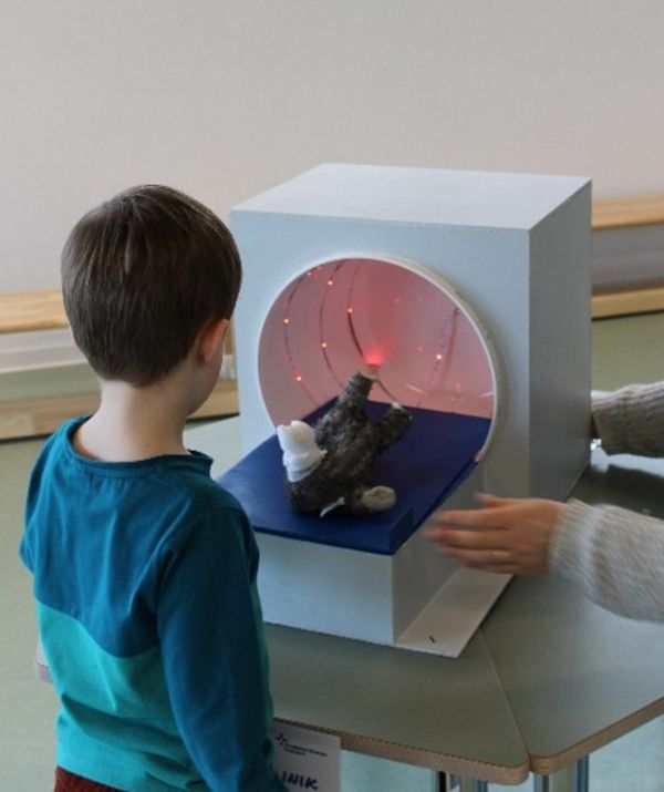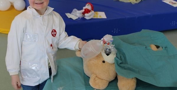 Ein besonderes Highlight ist der OP-Saal. Dafür ziehen die Kinder OP-Kittel, Handschuhe und Masken an. Gemeinsam untersuchen sie Teddybär Bruno. Er bekommt eine Atemmaske auf und wird von den Kindern vorsichtig beatmet. Danach folgt eine Bauch-Operation: Von Herz bis Darm können die Organe herausgenommen, betrachtet und anschließend wieder eingesetzt werden. So erhalten die Kinder einen anschaulichen Einblick in den Aufbau des Körpers.