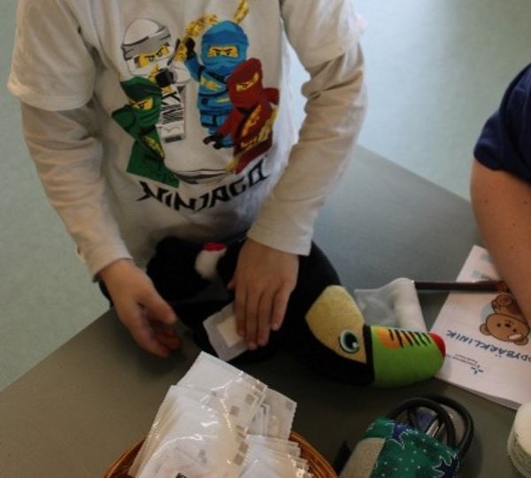Bei der Untersuchung dürfen die Kinder selbst aktiv werden. Mit einem echten Blutdruckmessgerät messen sie den Blutdruck, anschließend wird die verletzte Stelle „geröntgt“. Mit Verbänden und Pflastern versorgen sie liebevoll die Wunden ihrer Kuscheltiere. In der Apotheke erhalten die Kinder Traubenzucker, ein Pflastertäschchen sowie einen Luftballon, damit sie ihr Kuscheltier auch zuhause weiter pflegen können.